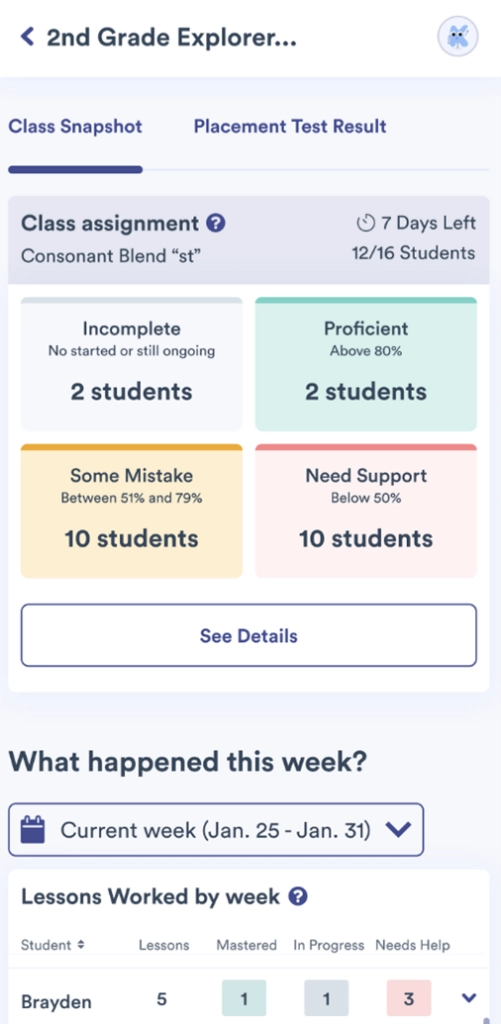 As shown in the following screenshot, teachers can assign a specific topic each week directly from their phone, tablet, or computer. For teachers, monitoring student progress has never been easier. This invaluable feedback not only saves time on assessment but also supports teachers in making data-driven instructional decisions.