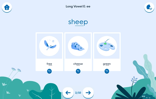 Recognizing the importance of direct, explicit instruction in foundational skills, Lalilo has recently strengthened its instructional components by introducing the lesson using visual and auditory cues, often relating new information to skills previously taught, because we know how important that connection to prior knowledge is for a student’s ultimate understanding. For example, in the lesson below, the student hears an audio instruction that explains the concept: “When the letters ‘ee’ are together, they make the long E sound like you hear in the word ‘sheep.’”