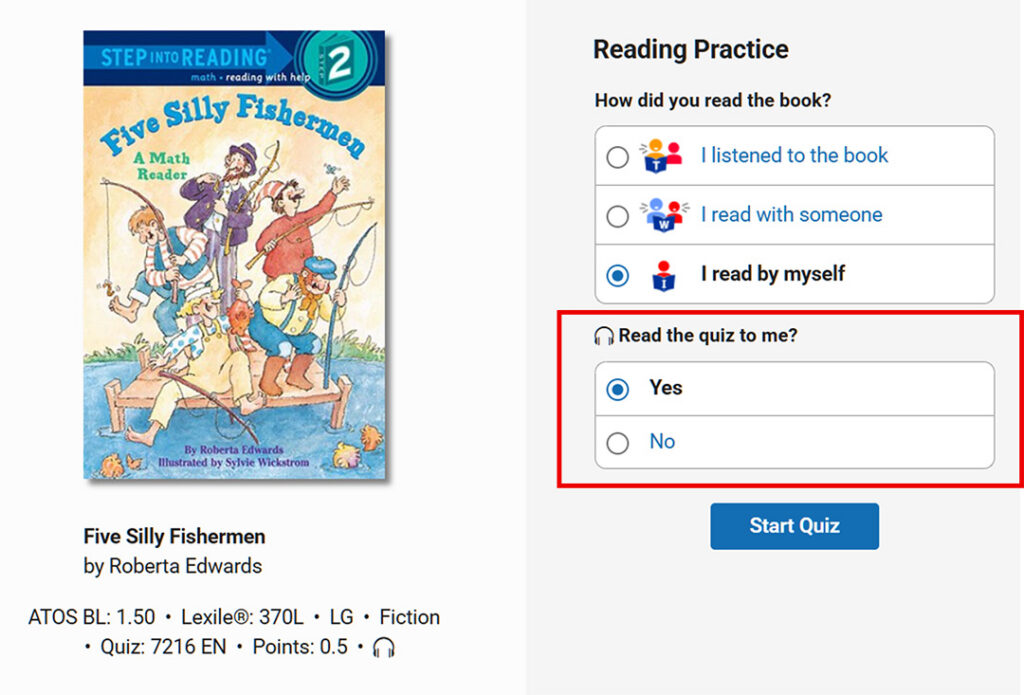 When students are ready to take a quiz and indicate how they read the book, they can select Yes to have the quiz read aloud. The questions and answer choices will play automatically, and students can pause at any time to reflect before answering.