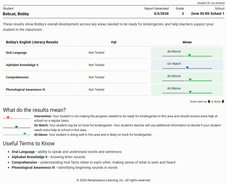 Modeled after the existing Star CAT + Star CBM Caregiver Report, the Star Preschool Literacy Caregiver Report ensures that administrators and teachers can communicate screening results to caregivers in a clear, consistent, and meaningful way. Caregivers receive an easy-to-understand explanation of what the assessment measures, why the skills matter for early literacy and kindergarten preparedness and success, how to interpret results, and how they can partner with educators to support their child’s literacy development.