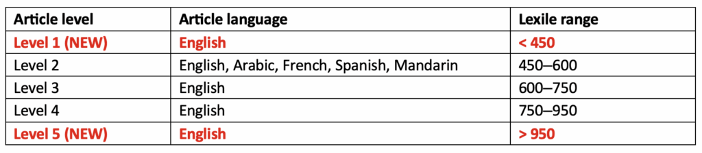 For world language learners, articles in Arabic, French, Spanish, and Mandarin remain at a consistent Level 2, offering a steady path for building literacy in another language.